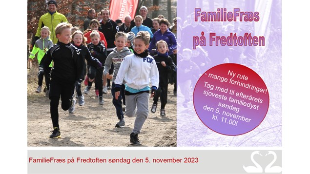 FamilieFræs på Fredtoften vender tilbage søndag den 5. november kl. 11. Denne begivenhed byder på en tre kilometer lang rute fyldt med sjove forhindringer i varieret terræn, hvor der er mulighed for at blive både våd og mudret.